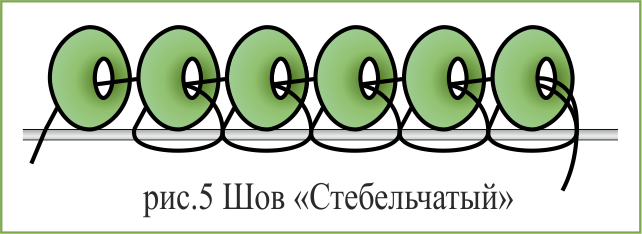 Вместо шва «Назад иголку» можно использовать «Стебельчатый» шов (рис.5), при этом бисеринки ложатся плотнее и ровнее.