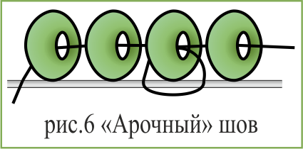 «Арочный» шов применяется, если не требуется плотного прилегания бисеринок к ткани или желательно, чтобы вышивка не была жесткой.