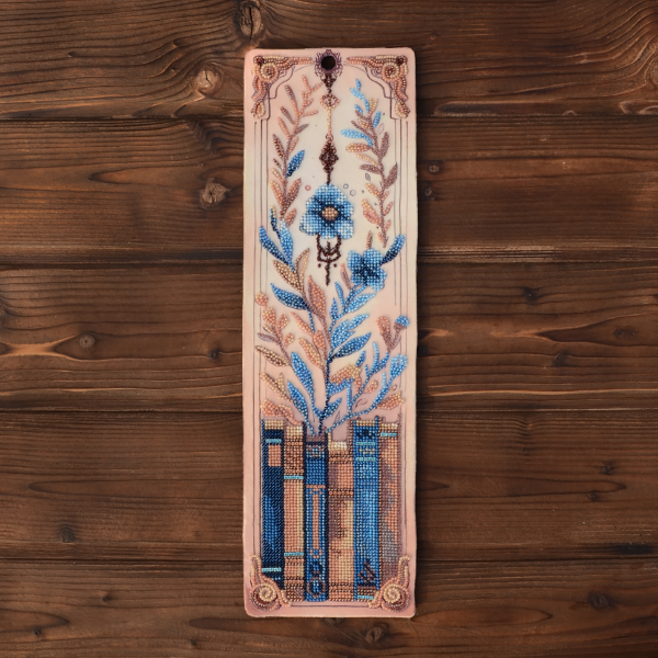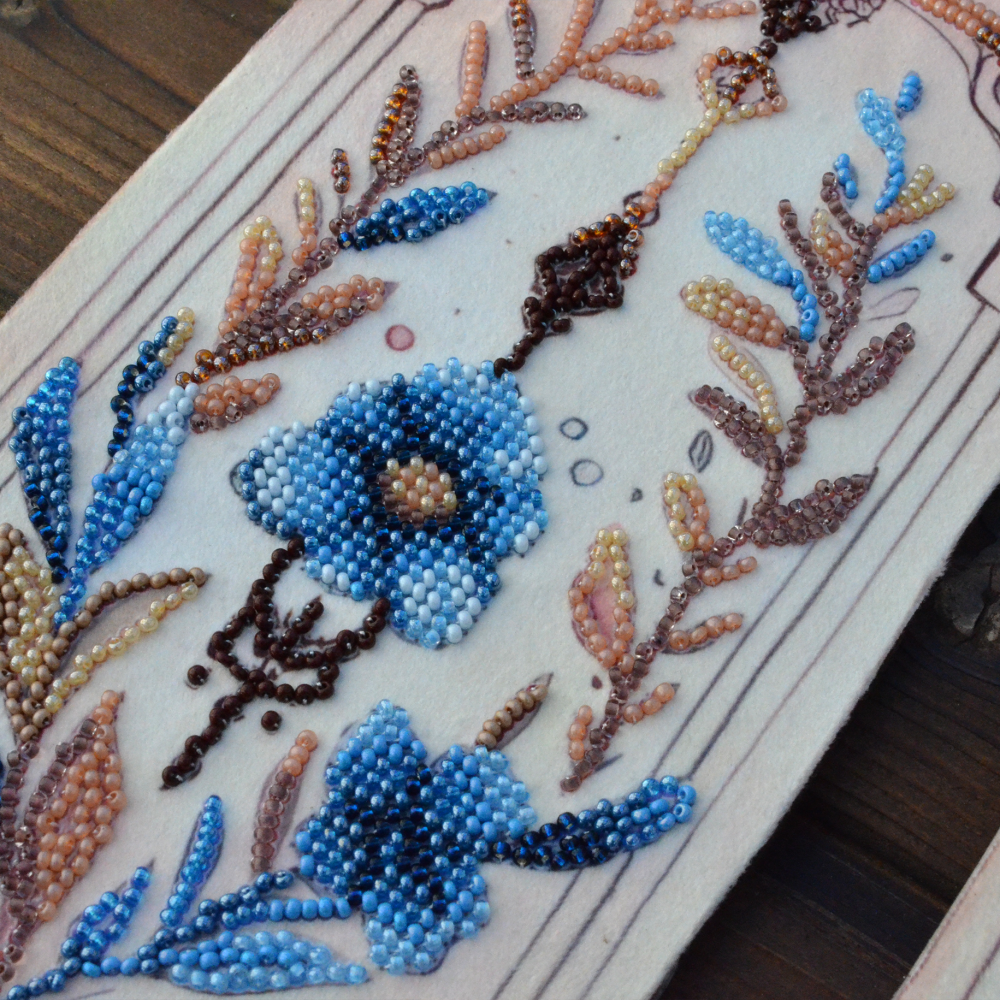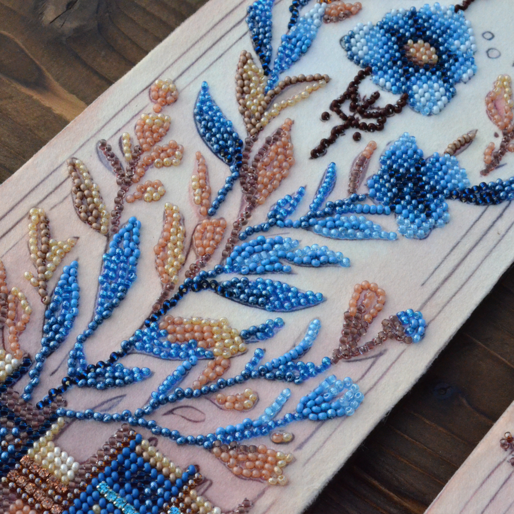 The embroidery pattern is printed on velour, and the kit includes Preciosa Ornela beads, a rhinestone chain, and a beading needle.