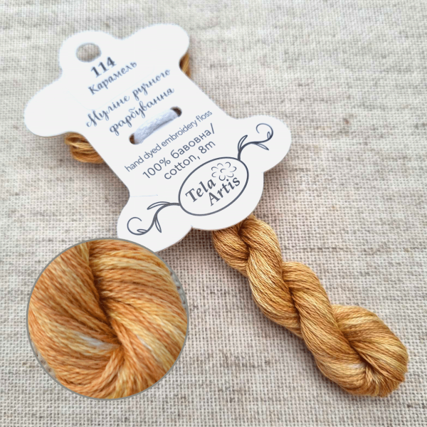 Hand-dyed floss hand-dyed by Tela Artis, based on DMC, 8m per skein, 6 threads per strand.