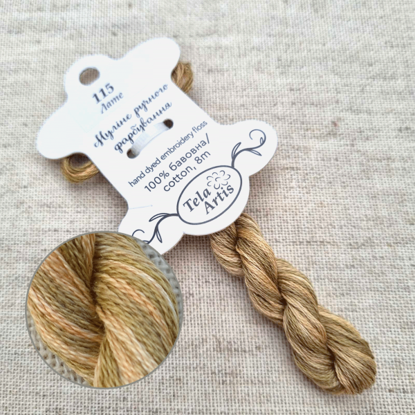 Hand-dyed floss hand-dyed by Tela Artis, based on DMC, 8m per skein, 6 threads per strand.