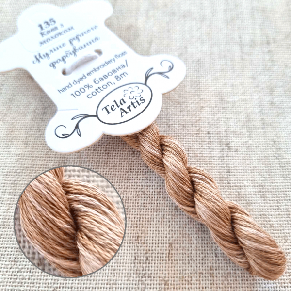 Hand-dyed floss hand-dyed by Tela Artis, based on DMC, 8m per skein, 6 threads per strand.