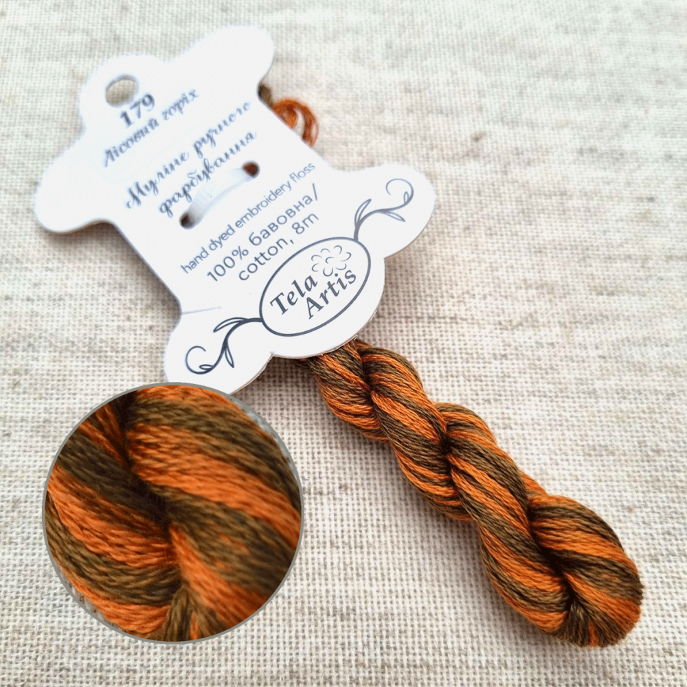 Hand-dyed floss hand-dyed by Tela Artis, based on DMC, 8m per skein, 6 threads per strand.