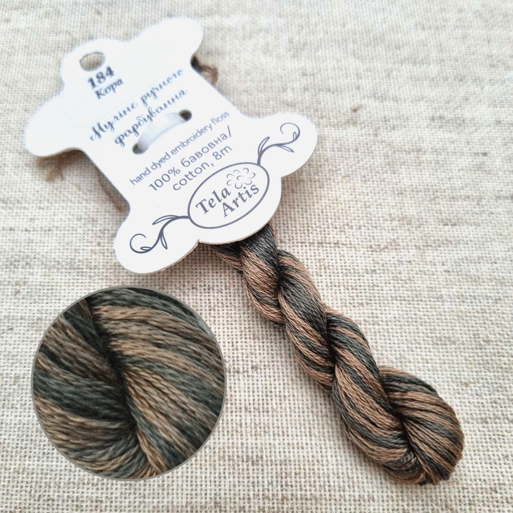 Hand-dyed floss hand-dyed by Tela Artis, based on DMC, 8m per skein, 6 threads per strand.