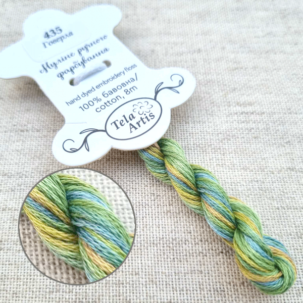 Hand-dyed floss hand-dyed by Tela Artis, based on DMC, 8m per skein, 6 threads per strand.