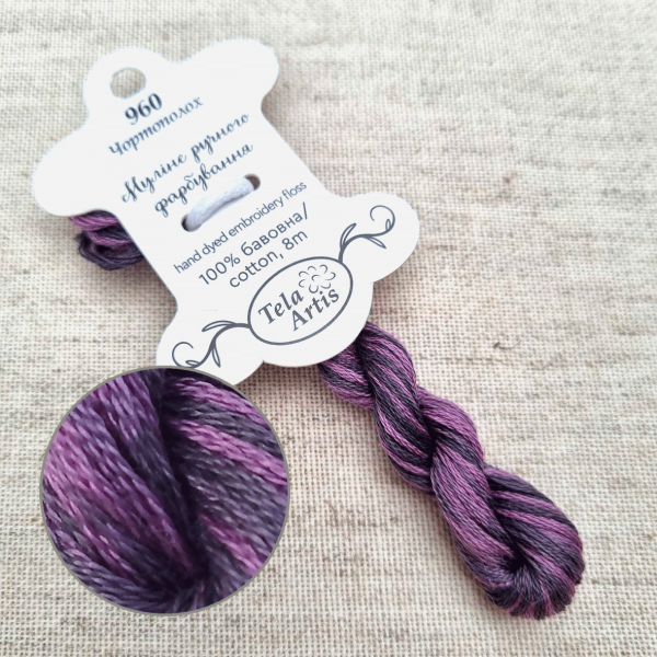 Hand-dyed floss hand-dyed by Tela Artis, based on DMC, 8m per skein, 6 threads per strand.