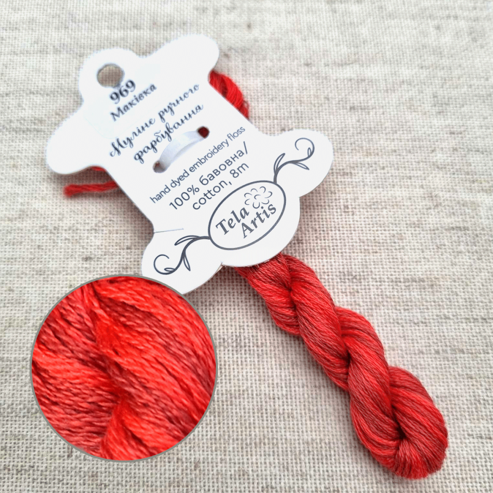 Hand-dyed floss hand-dyed by Tela Artis, based on DMC, 8m per skein, 6 threads per strand.