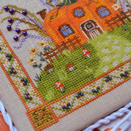 Create a richly textured and dimensional design featuring hand-dyed variegated floss, fluffy thread accents, beads, pearls, and decorative stitches. This project combines classic cross stitch with French knots and Lazy Daisy stitches for a beautifully detailed finish.