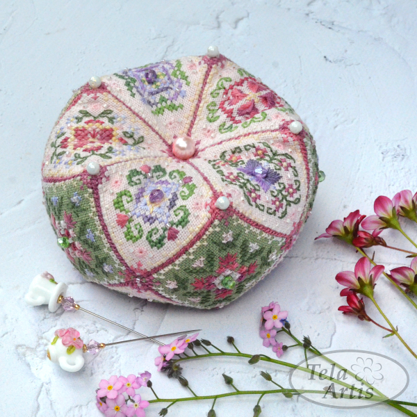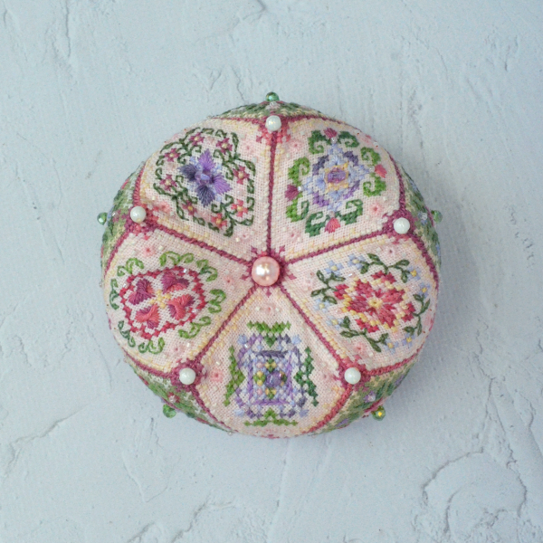 Stitches used in the pattern: Includes decorative stitches such as fan stitch, eyelet, herringbone, Rhodes stitch, rice stitch, satin stitch, and Bulgarian cross stitch, as well as 15/0 microbeads.