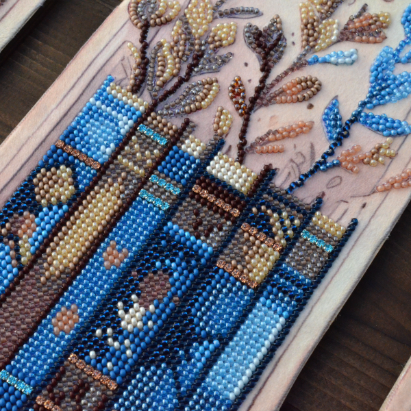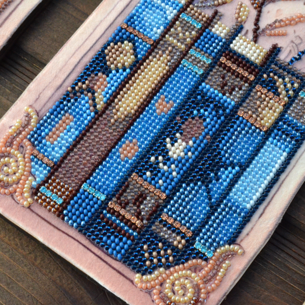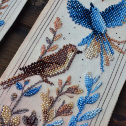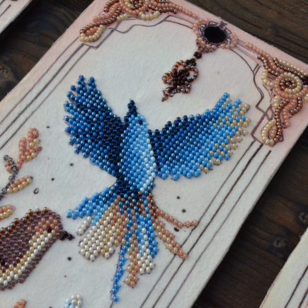 After completing the embroidery, cut out the design along the contour and attach it to the board using fabric glue, applying it gradually in small sections.