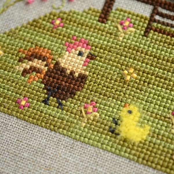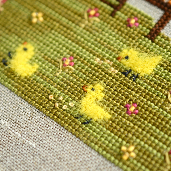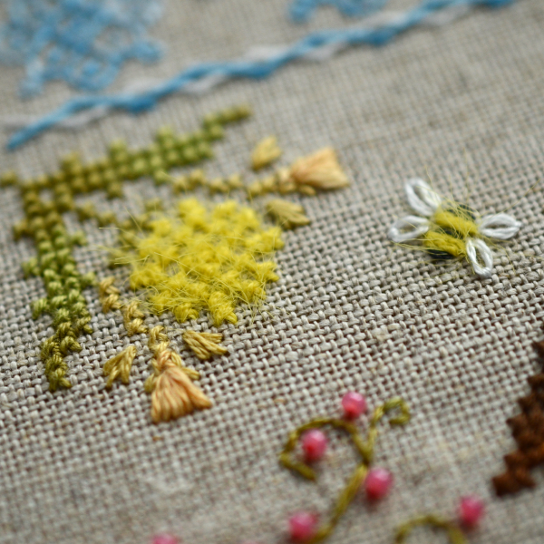 In addition to the cross, there is a backstitch, eyelets, ray stitches, open harringbone, French knot.