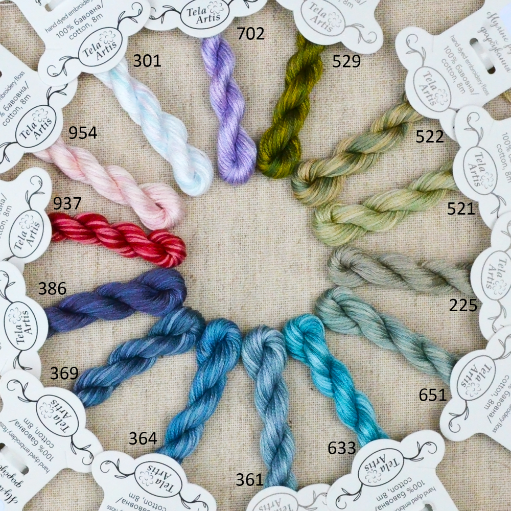 Hand-dyed floss hand-dyed by Tela Artis, based on DMC, 8m per skein, 6 threads per strand - 14 colors pack