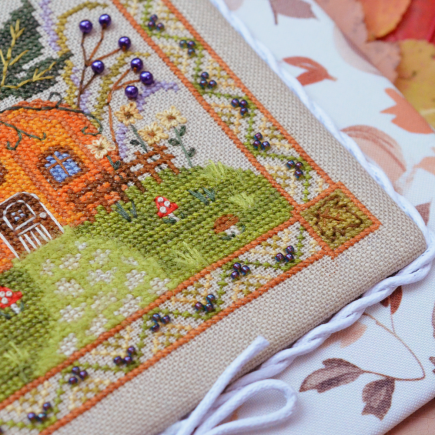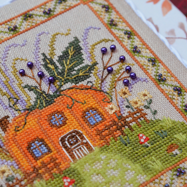 Create a richly textured and dimensional design featuring hand-dyed variegated floss, fluffy thread accents, beads, pearls, and decorative stitches. This project combines classic cross stitch with French knots and Lazy Daisy stitches for a beautifully detailed finish.