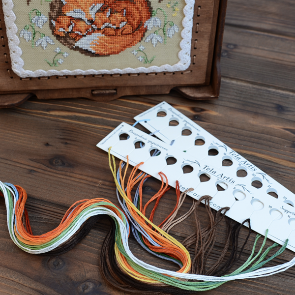 Floss key for standard DMC and hand-dyed Tela Artis floss (includes calculations for 14- and 16-count Aida fabric)